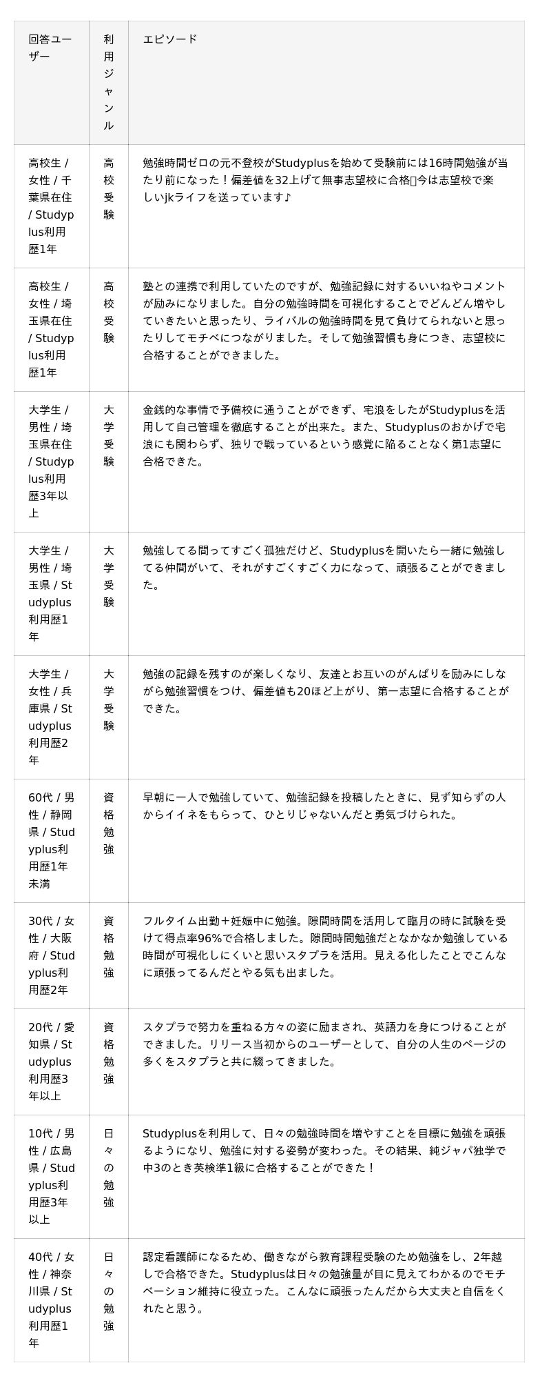 今後、スタディプラス公式note https://note.com/studyplusinc を通じて、「Studyplus」ユーザーのエピソードを紹介するインタビュー企画「#わたしとStudyplus」を公開する予定です。