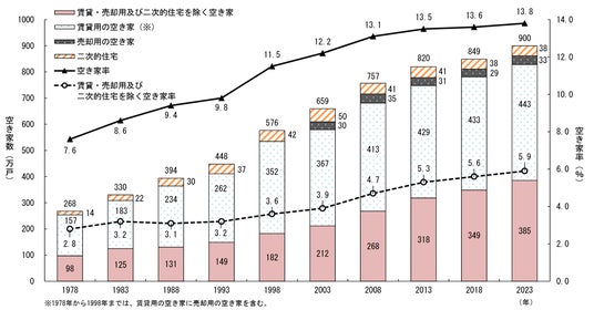 令和5年 住宅・土地統計調査 空き家数及び空き家率の推移-全国(1978年~2023年)