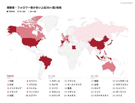 一般的に動画プラットフォームでは1分半~2分を超えると離脱率が高まる傾向がある中、本シリーズの多くは3~5分の動画尺にも関わらず、完全視聴率が30%を超える作品が頻出。さらに、「お気に入り/保存率」「フォロー率」ともに10%を超える作品も多く、一過性の視聴ではなく、旅のインスピレーションや文化的共感として受け止められていることがうかがえます。視聴者は、アメリカ・ドイツ・カナダ・オーストラリアなどの欧米諸国に加え、中国(本土)・香港・台湾・韓国・タイ・インド・マレーシアなどアジア諸国・地域にも広がり、国境を越えた共感が生まれています。