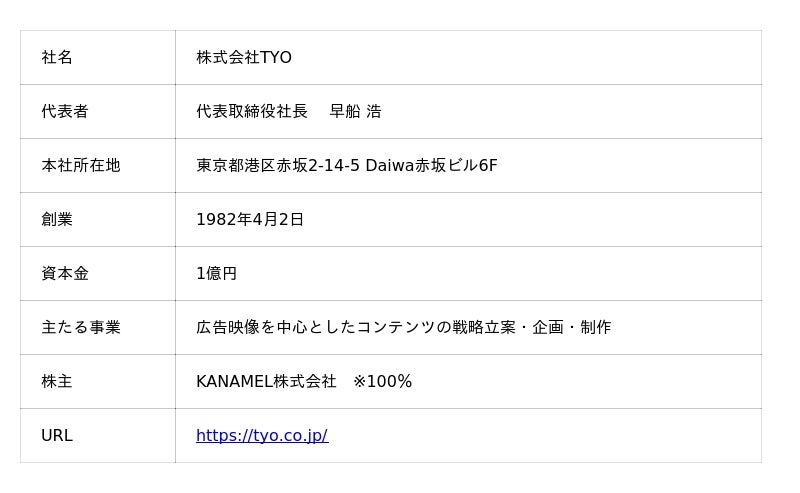 TYOは広告映像を中心としたコミュニケーションコンテンツの戦略立案・企画・制作を手掛けるプロデュースカンパニーです。テレビCM・オンライン動画等の年間制作本数は1,000本以上。総社員数約300名、85名ものプロデューサーが在籍しており、国内映像プロダクション業界でもトップクラスの規模を誇ります。【最高の制作チームで、領域を超え、心を動かし、「伝わる」ものを作りつづける。】をMissionに掲げ、多様な価値観が共存できる社会を目指し、今日も誰かの心を動かすものを作りつづけています。