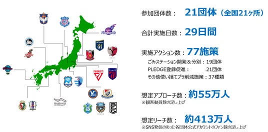 今回参加した21団体には、使い捨てプラスチックの削減施策、効果測定、エコステーションの開発による啓発活動に加え、各団体のファンに向けて、環境問題への意識向上や使い捨てプラスチック削減を促す行動喚起型の企画を実施いただきました。