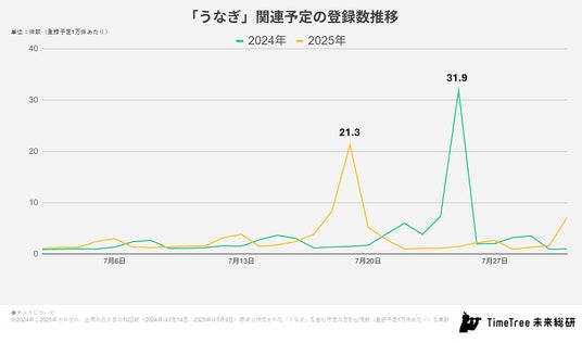 株式会社TimeTree(本社:東京都新宿区、代表取締役社長:深川 泰斗)の社内研究所『TimeTree未来総合研究所』(https://timetreeapp.com/intl/ja/future-research-institute)は、TimeTreeユーザーの予定動向をもとに、夏の風物詩である「土用の丑の日」についてのトレンドを分析しました。