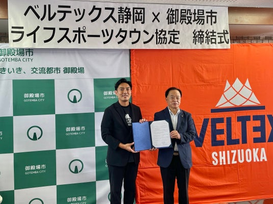 この度、ベルテックス静岡は、御殿場市と相互協力のもと、双方の資源を有効に活用し、協働することにより、スポーツの振興及びスポーツを通じた地域づくりを進め、持続的な地域の発展に資することを目的とした「ライフスポーツタウン協定」を締結し、7月14日(月)に、御殿場市役所において締結式を執り行いましたのでお知らせいたします。