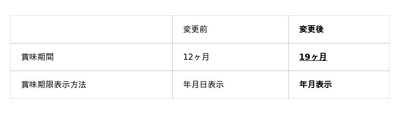 賞味期間を12ヶ月から19ヶ月に延長し、表示方法を年月日から年月表示に変更
