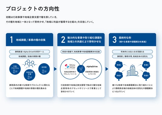 本プロジェクトでは、100年以上の歴史を持ち、静岡県の振興に貢献してきた静岡鉄道と、事業開発のノウハウと地域への強い思いを持つAlphaDriveがタッグを組むことで、地域との共創により、静岡県の活性化と地域課題解決に向けた具体的な事業を立ち上げ実施していくことを目指します。また中長期的には地域の他の企業とも共創しながら、地域の中で循環する取り組みが実現できるようにしていきます。