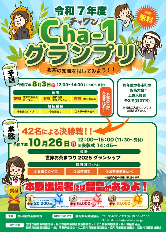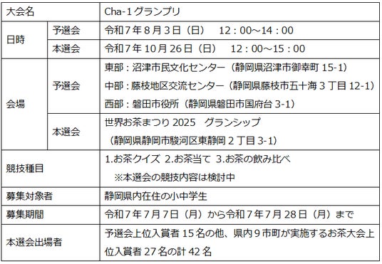静岡県小中学生にお茶の知識や技能を楽しんで習得してもらい、より自発的に静岡茶を愛飲してもらうことを目的として、お茶の知識や技能を競い合う「Cha-1グランプリ」を開催します。