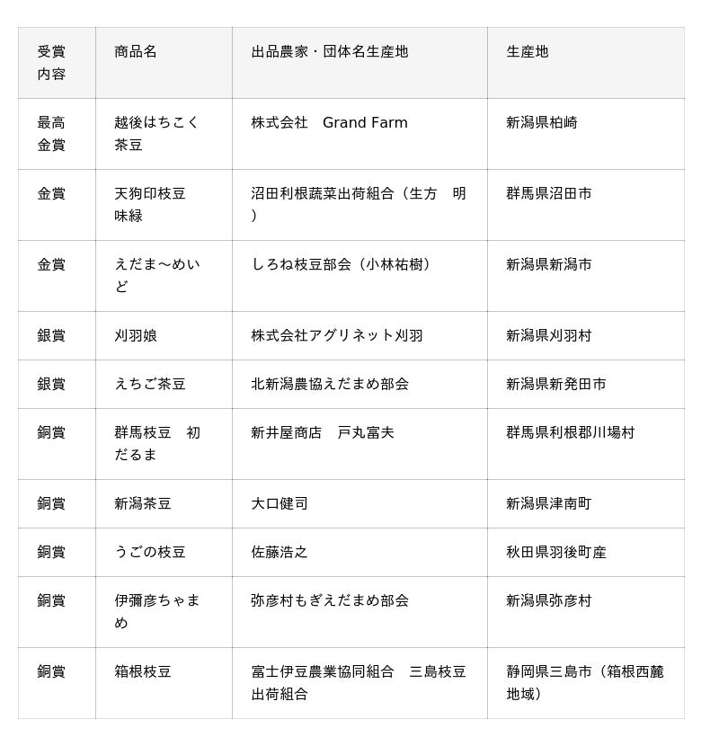 「第4回 全国えだまめ選手権」新潟県柏崎「越後はちこく茶豆/株式会社 Grand Farm」が最高金賞を獲得!