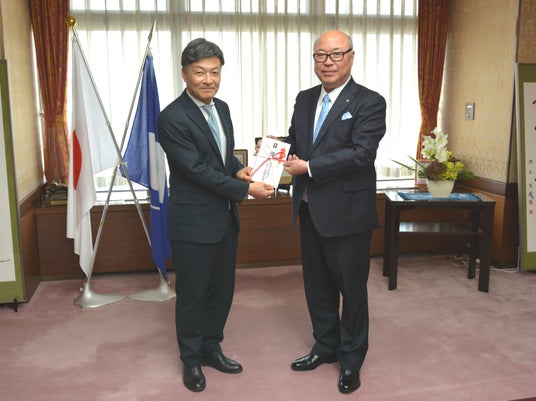 静岡市 寄附贈呈式 難波喬司市長(左)と小糸製作所 社長 加藤充明(右)