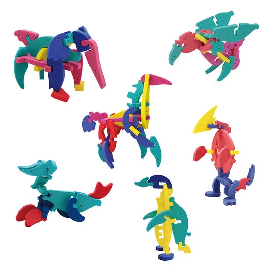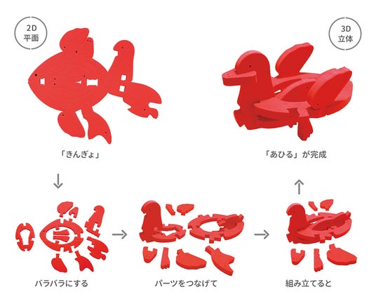 2D⇔3Dでトランスフォームが楽しめる平面のかたちを立体のかたちに組み換え、別の生き物を作ることができるので、1セットで2種類のパズルが楽しめます。