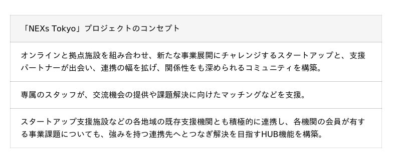 東京都では、地域、業界、業種にとらわれない連携関係の創出を目指し、更なる成長を志向するスタートアップを総合的に支援する「NEXs Tokyo (Nexus Ecosystem Xs Tokyo)」プロジェクトを実施しています。NEXs Tokyoでは、取り組みの一つとして、個別ハンズオン支援により、新たな事業展開を目指すスタートアップと全国各地との連携事業を創出するプログラムを行っています。