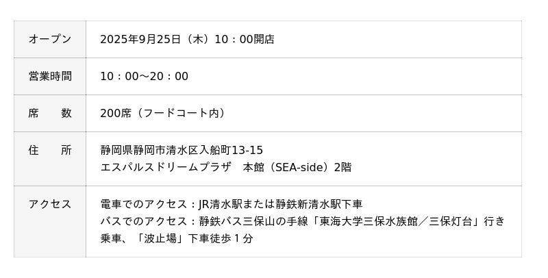 ウェンディーズ・ジャパン株式会社及び、ファーストキッチン株式会社(所在地:東京都新宿区、代表取締役:紫関修)は、ウェンディーズ・ファーストキッチン清水エスパルスドリームプラザ店が9月25日(木)にオープンすることをお知らせします。静岡県静岡市内でのウェンディーズ・ファーストキッチンの出店は初めてで、この地域の記念すべき1号店となります。清水エスパルスドリームプラザ店は、ウェンディーズとファーストキッチンとのコラボ店として、本国アメリカのWendy’sで人気の本格的なバーガーやサイドメニューや、ファーストキッチンで長年親しまれてきたフレーバーポテトやフロートなども販売します。当店は、ショッピング・映画・グルメ・イベントが楽しめるショッピングモールのフードコート内にあり、お子さまやファミリーにもお楽しみいただけるメニューを取り揃えています。