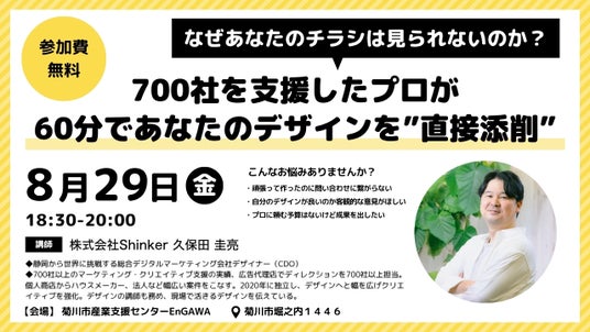 Shinker.Co.Ltd株式会社Shinker(本社:静岡県静岡市/代表:曽根田 光)は、2025年8月29日(金)に静岡県菊川市・産業支援センターEnGAWAにて、デザインをその場で“公開添削”する実践型セミナーを開催予定