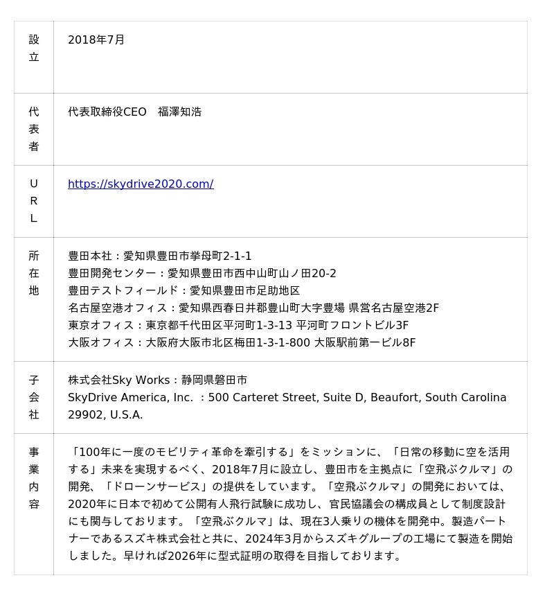 株式会社SkyDriveエアタクシーや資源開発分野での輸送を検討。最大30機のプレオーダーも合意