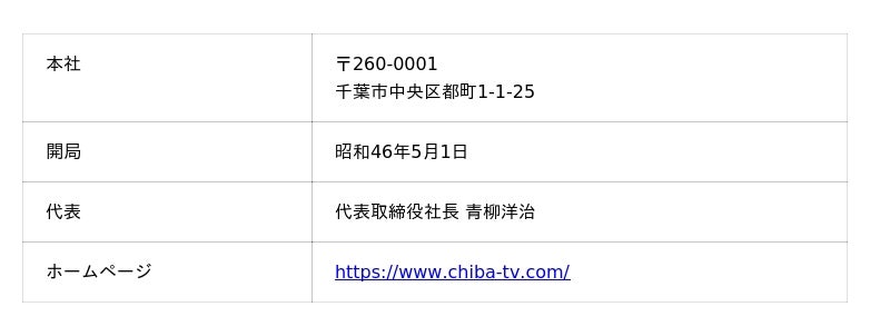 千葉テレビ放送株式会社(チバテレ)は千葉県を放送エリアとする放送局です。地域情報番組「ちば朝ライブ モーニングこんぱす」の他、スポーツ中継などを中心に放送しています。