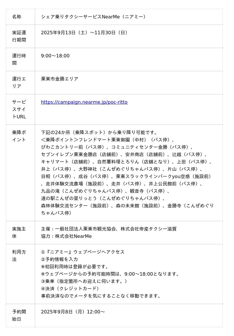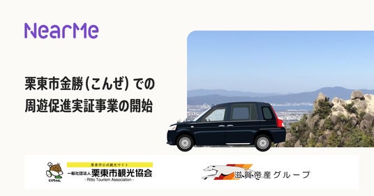 移動の課題に取り組むソーシャルデザインカンパニーの株式会社NearMe(本社:東京都中央区、代表取締役社長:高原幸一郎、以下:ニアミー)と、一般社団法人栗東市観光協会(会長:田中義信、所在:滋賀県栗東市)、株式会社帝産タクシー滋賀(代表取締役:牧村善進、所在:滋賀県草津市)は、ニアミーの“シェア乗り”タクシーサービスを用いて、栗東市金勝(こんぜ)での周遊促進実証事業を2025年9月13日(土)より、開始します。