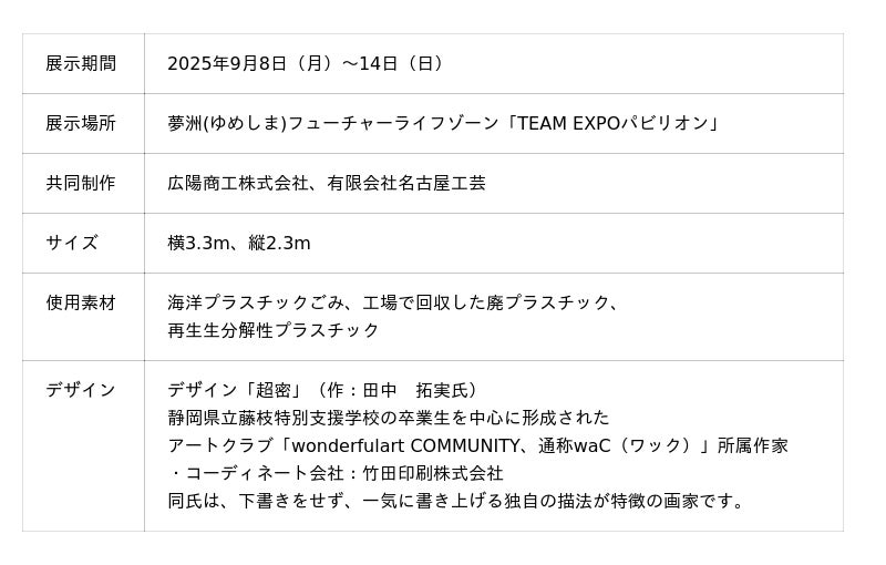 株式会社サニックスホールディングス株式会社サニックスホールディングス(本社:福岡県福岡市、代表取締役社長 宗政 寛)は、 2025年9月8日(月)から14日(日)にかけて、2025年日本国際博覧会(大阪・関西万博)の 「TEAM EXPOパビリオン」において、海洋・産業廃棄物由来の廃プラスチックを使用した壁画アートを展示します。