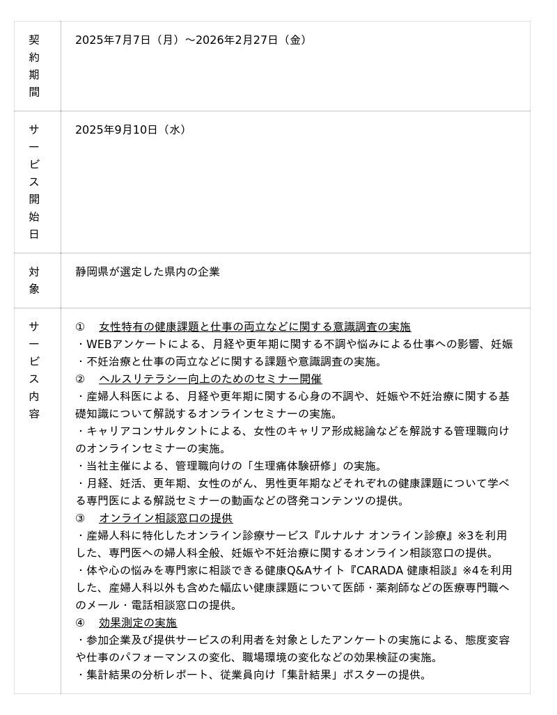 当社は静岡県より本事業を受託し、静岡県内で働く女性の健康課題の改善をサポートすることとなりました。当社が提供する法人向けフェムテックサービス『ルナルナ オフィス』※2による企業への支援実績を活かし、サポートサービスを実施します。