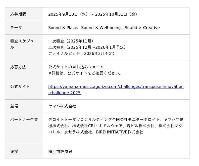 ヤマハ株式会社(以下、当社)は、世界中の企業とともに、音を起点とした新たな価値創出を目指すグローバルビジネスコンテスト「TRANSPOSE Innovation Challenge」を開催します。