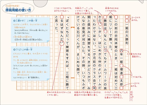 表側には原稿用紙の使い方、裏側には作文の書き方を掲載しています。