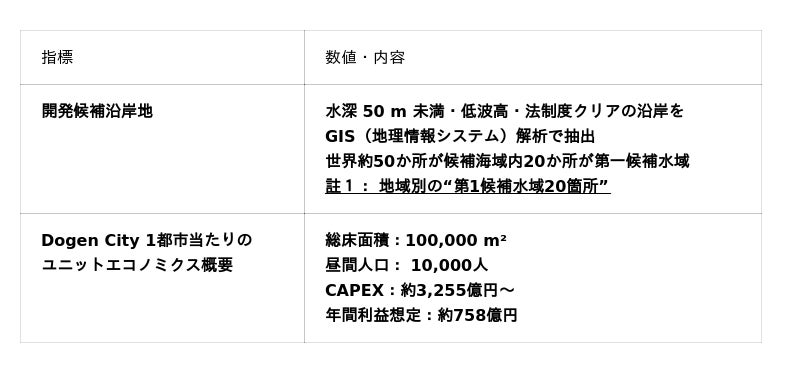 大型客船の長期係留=即時ホテルシティ(医療・教育・商業を内包)により、早期売上×デマンド・シグナルを得てから本格増設へ。初期キャッシュフローの前倒しが案件の信用力を押し上げます。