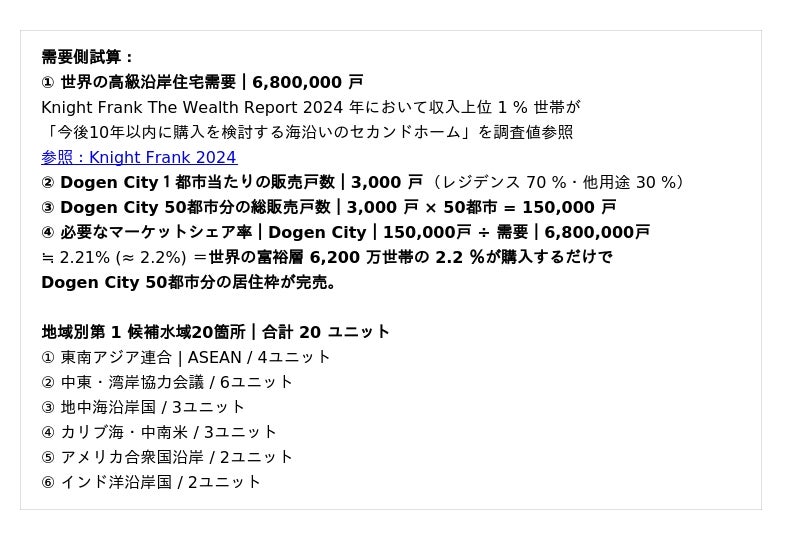 出典:Knight Frank Wealth Report 2024/2025(富裕層動向;沿岸セカンドホーム嗜好の元データ)、当社推計(6,200万世帯×0.3%・「680万戸」積上げの内部推計)、関連レポート。