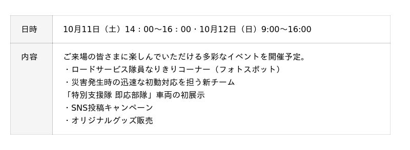 普段はなかなか目にする機会のない、ロードサービスの隊員の高度な技術を間近でご覧いただける絶好の機会となります。ぜひ2日間にわたるさまざまなイベントをお楽しみください。
