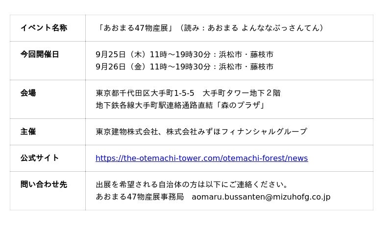 東京建物と〈みずほ〉で取り組む地域創生 「あおまる47物産展」東京・大手町タワーで開催2025年9月は浜松市・藤枝市の名産品が集結