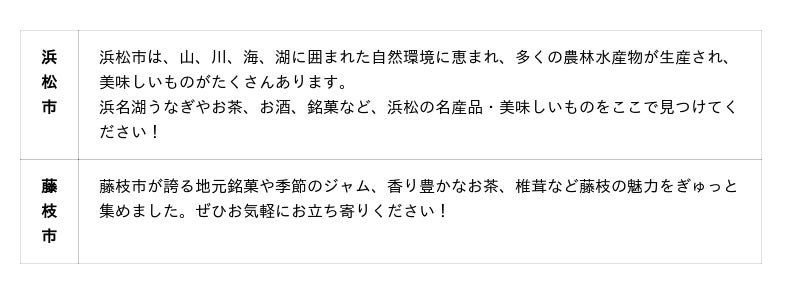 2025年9月は、25日(木)・26日(金)に浜松市・藤枝市の名産品が出展されますので、お知らせします。