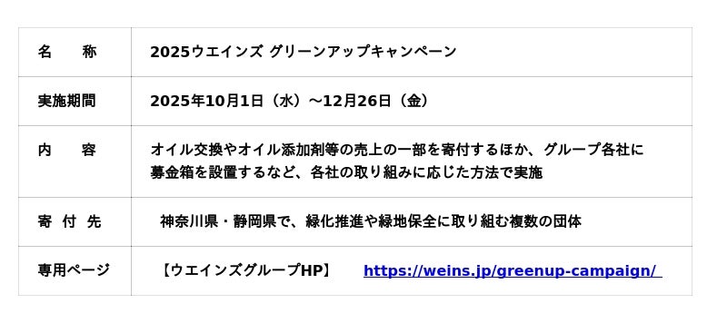 2025年10月1日(水)から12月26日(金)までの3か月間、神奈川県および静岡県の緑化推進を目的とした「2025ウエインズ グリーンアップキャンペーン」を実施いたします。