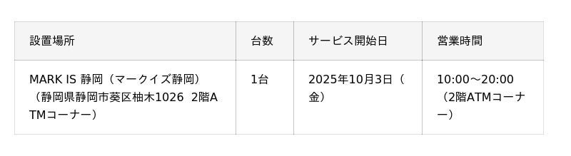 株式会社ローソン銀行当行は、三菱地所プロパティマネジメント株式会社(東京都千代田区、代表取締役 社長執行役員 久保 人司、以下「三菱地所プロパティマネジメント」)と共同ATMの設置について合意し、2025年10月3日(金)に三菱地所グループが展開する大型商業施設「MARK IS 静岡(マークイズ静岡)」(静岡市葵区)にローソン銀行ATM新型機を1台設置いたしました。「MARK IS」ブランドへの当行ATMの設置は今回がはじめてです。