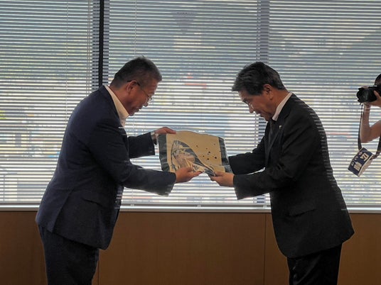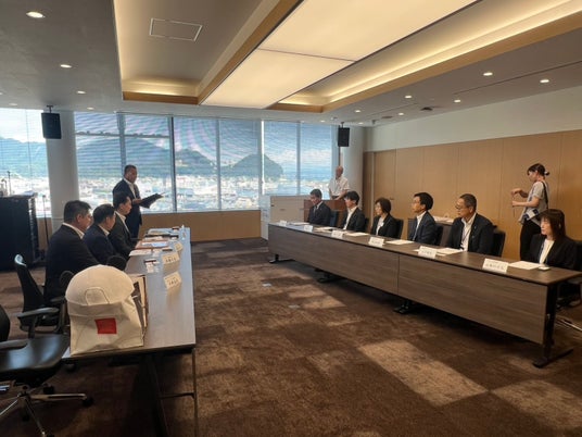 左より、中野弘道市長、田島通利専務取締役、大庭康広執行役員