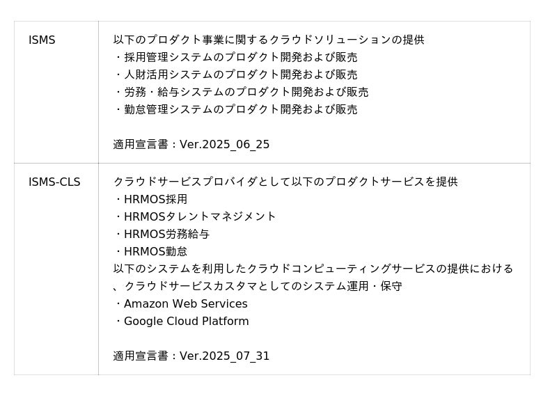 株式会社ビズリーチ(所在地:東京都渋谷区/代表取締役社長:酒井哲也)が運営する、人財活用プラットフォーム「HRMOS(ハーモス)」シリーズは、情報セキュリティマネジメントシステム(ISMS)の国際規格「ISO/IEC 27001」およびクラウドサービスセキュリティの国際規格「ISO/IEC 27017」の認証を、HRMOS採用、HRMOSタレントマネジメント、HRMOS労務給与、HRMOS勤怠にて2025年9月25日に取得しました。