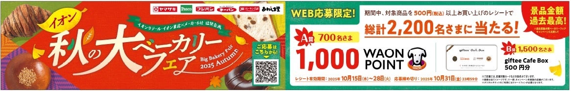 「イオン秋の大ベーカリーフェア2025」期間中、イオンで協賛メーカー6社(ヤマザキ・パスコ・フジパン・第一パン・YKベーキングカンパニー・あわしま堂)の対象商品を税込500円以上お買い上げで総計2,200名さまに、WAON POINTまたはデジタルギフトが当たる企画を開催します。