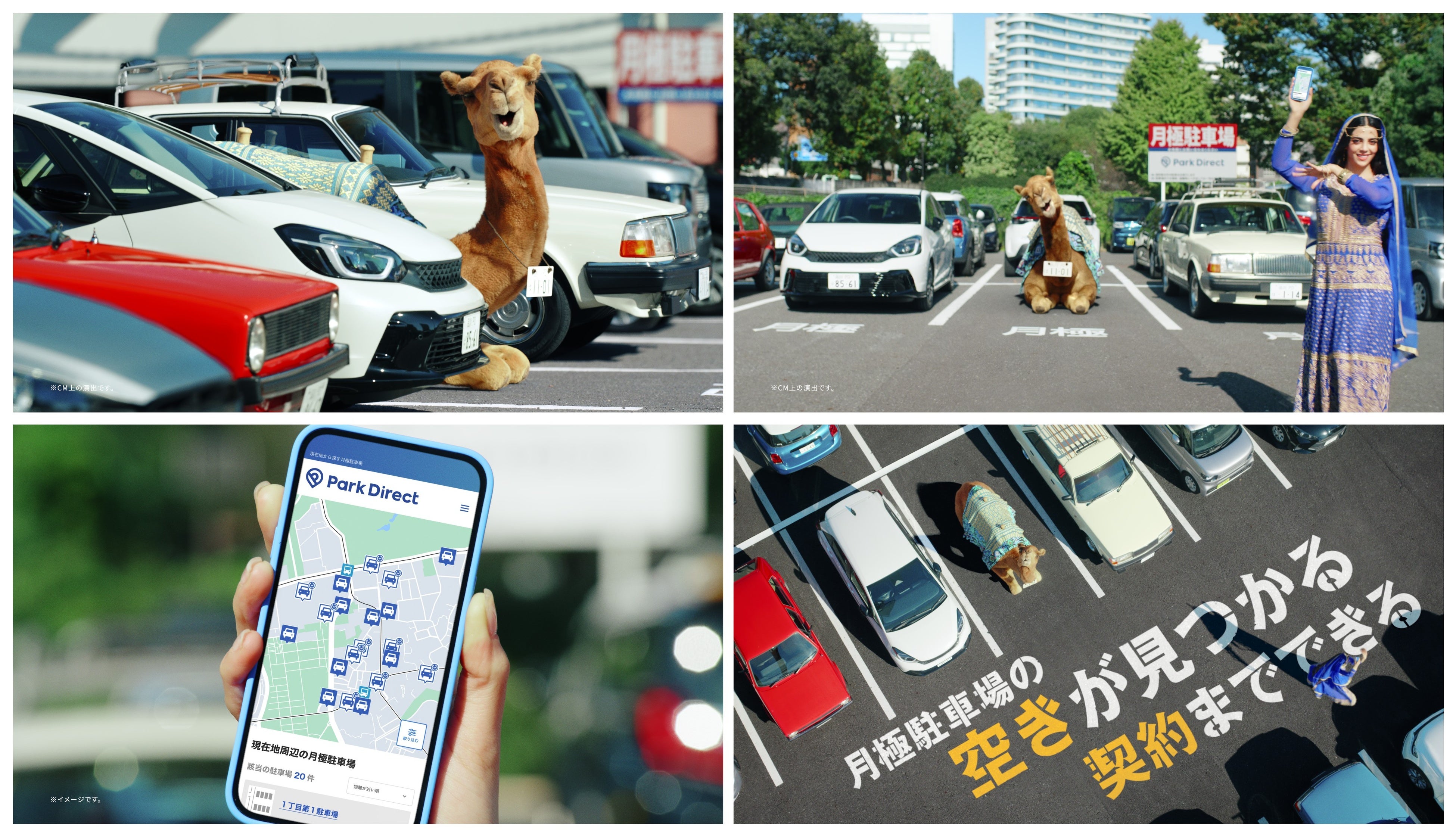 パークダイレクト のカラーである “青” を基調とした布を背中に掛け、砂漠の国から“車両”として来日したラクダが首から日本のナンバープレートを下げ、月極駐車場に座って「駐ラクダ」している強烈なインパクトのCMです。ラクダの持ち主である“女性(=ドライバー)”も登場し、スマホで月極駐車場が契約できて喜び踊っています。