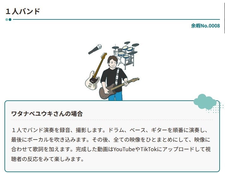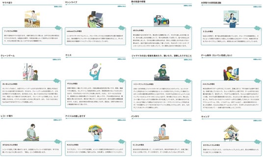 こうした問題意識のもと,2024年7月より静岡大学教育学部塩田真吾研究室とヤマハ新価値グループでは,余暇に関する共同研究をスタートし,「人生を楽しむための余暇図鑑」を開発しました。余暇図鑑では,約100名のヤマハの社員が余暇をどのように過ごしているかを掲載し,それらを子どもたちが閲覧することで,自分の「余暇の過ごし方」や「人生を楽しむこと」について考えを広げることを目的としています。