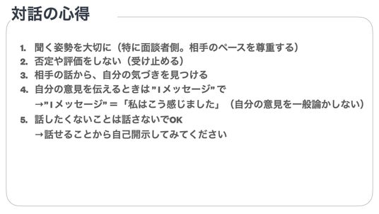 ガイドラインには、対話の心得や質問例、話したくないことを話さない自由、フィードバックの仕方などを明記。