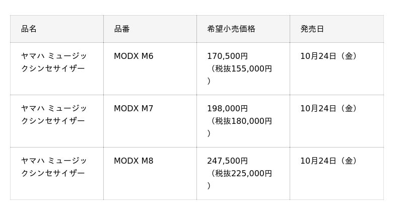 ヤマハ株式会社(以下、当社)は、デジタル楽器の新製品として、フラッグシップモデル「MONTAGE Mシリーズ」のDNAを継承したヤマハ ミュージックシンセサイザー『MODX Mシリーズ』(『MODX M6』『MODX M7』『MODX M8』の3品番)を10月24日(金)に発売します。