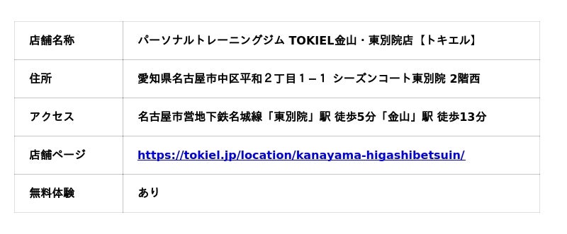 「運動習慣をつけ、美しく健康な身体に導く」がコンセプトのパーソナルトレーニングジム『TOKIEL 【トキエル】』を展開する株式会社TIU(本社:東京都台東区、代表取締役 篠田拓也)は、2025年10月31日に名古屋市営地下鉄名城線「東別院」駅 徒歩5分「金山」駅 徒歩13分(住所:〒460-0021 愛知県名古屋市中区平和2丁目1−1 シーズンコート東別院 2階西)に『パーソナルトレーニングジム TOKIEL金山・東別院店【トキエル】』がオープン。