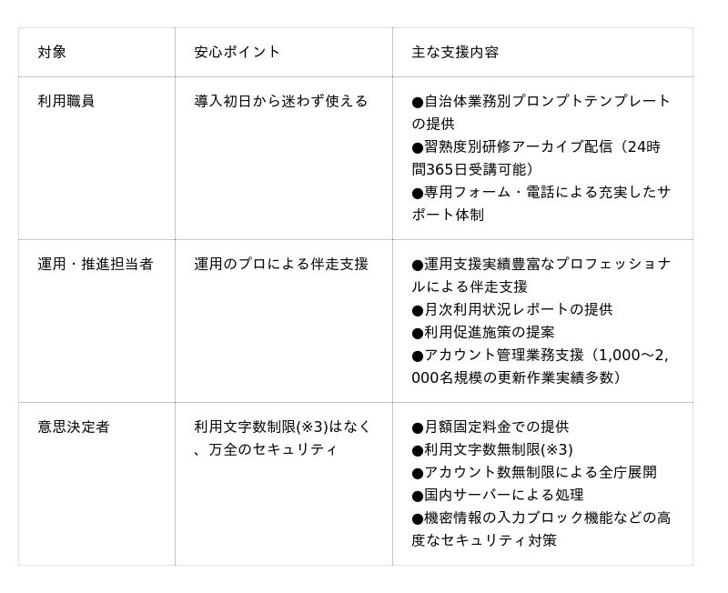 - 使い放題言語モデルを標準搭載:文字数上限を気にせず、全職員の積極的なAI活用を促進(※3)