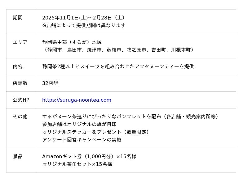 静岡県中部エリアの観光地域づくりに取り組む公益財団法人するが企画観光局(静岡県静岡市)は、2025年11月1日(土)から「するがヌーン茶」(読み方:するがヌーンティー)プロジェクトを実施します。