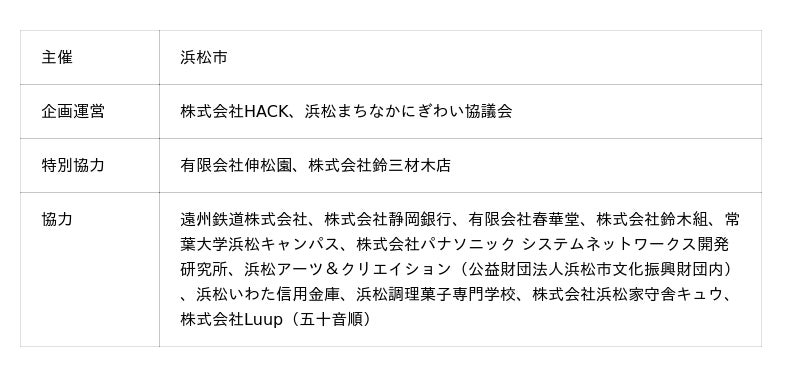 浜松市浜松市では、昨年度開催した「まちなか賑わい創出ワークショップ」において提案があった事業を基にし、公共空間「The GATE HAMAMATSU跡地」において、以下の通り実証実験を実施いたします。