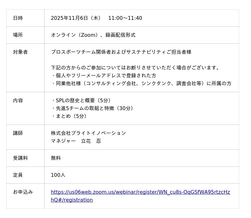 エンビプロ・ホールディングスエンビプログループの株式会社ブライトイノベーション(本社:東京都中央区、代表取締役社長:荻巣 和紀)は、プロスポーツチーム関係者およびサステナビリティのご担当者様向けに、無料ウェビナーを開催します。国連支援のサッカーチームの環境評価システムであるスポーツ・ポジティブ・リーグ(以下、SPL)に取り組む先進5クラブを例に、プロスポーツチームがどのように環境リーダーシップを実践しているかをコンサルタントがわかりやすく解説します。
