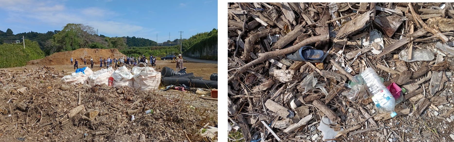 そのあと向かったのは撤去したごみの集積所です。木くずはチップ化されて有効利用されますが、プラスチック類などは廃棄物処理業者に処理を依頼しているということです。木くずの中には、たくさんのペットボトルやプラスチック片が混じっていて、処理や分別も大変なことを目の当たりしました。