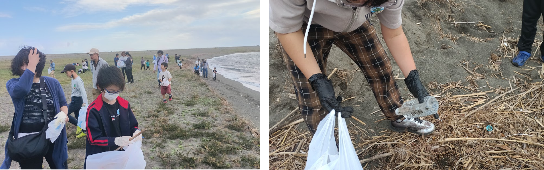 昼食後、一行は相模川の河口がある茅ヶ崎市へ。ここで桂川・相模川流域協議会の峯谷さんから、マイクロプラスチックごみなどの説明を受けました。この辺りの砂浜は海の流れの関係もあって、ごみは少ないものの、河口の岸辺には大量の生活ごみが流れ着くため、ごみ拾いを実施しているということです。そこで、河口でチームに分かれて、ごみ拾いをしてみることにしました。この日も木くずの間には小さなプラスチックごみがあり、中にはタイヤやポリタンクなどの大きなごみもありました。30分程で拾ったごみは合計20キロ。わずかとは言え、海洋ごみになるのを防ぐことができました。子どもたちからは「ごみをもっと減らさないと」「ごみを見つけたら拾うしかない」などの声が聞かれました。