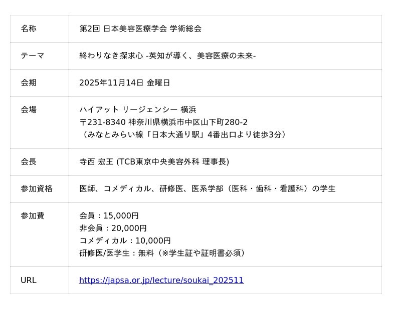 一般社団法人日本美容医療学会(事務局:東京都港区、代表理事:寺西 宏王、略称:JAPSA)は、2025年11月14日(金)、ハイアット リージェンシー 横浜(横浜市中区)にて「終わりなき探求心 -英知が導く、美容医療の未来-」をテーマに「第2回 日本美容医療学会 学術総会」を開催いたします。