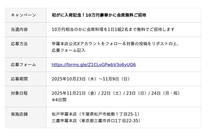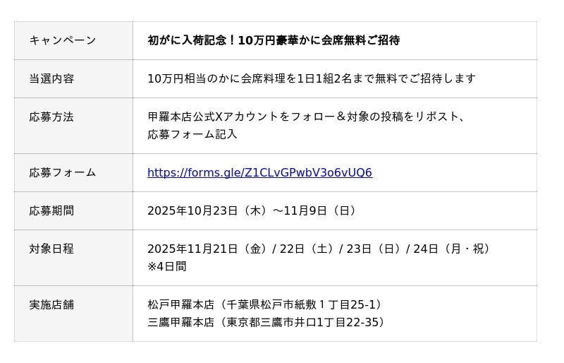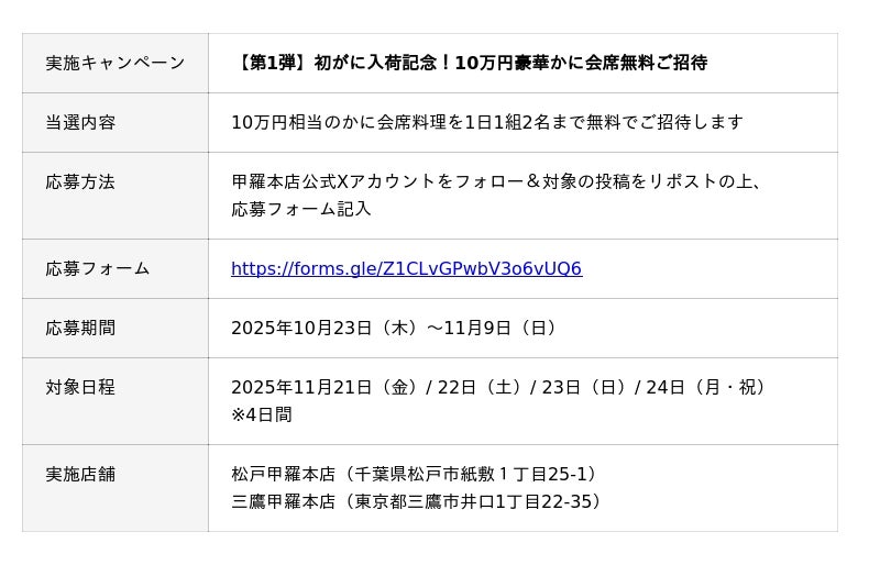 そんな“初がに”の入荷を記念し、甲羅本店では、10万円相当の「初がに豪華会席」を特別に仕立て、11月21日(金)~24日(月・祝)の4日間限定で各日1組(2名)を無料ご招待いたします。