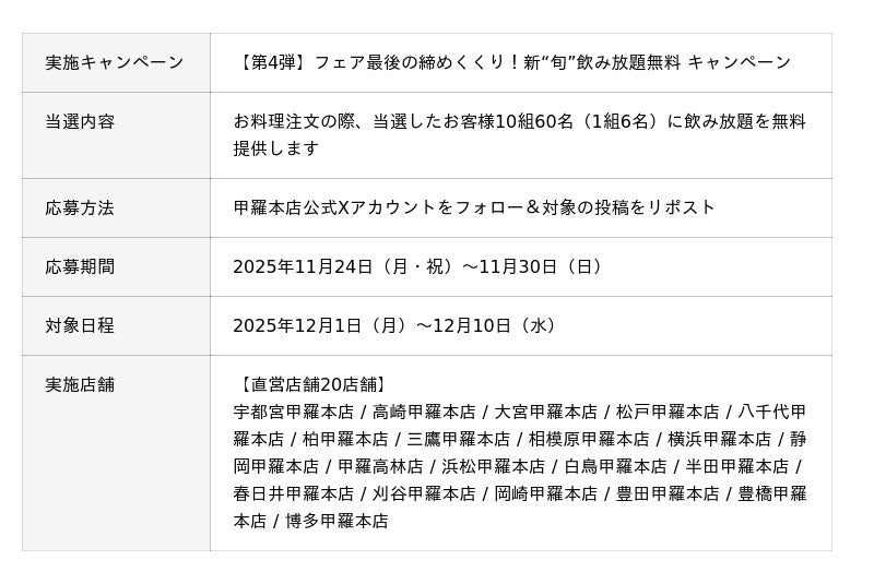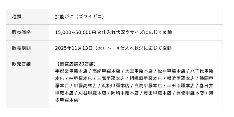 株式会社甲羅(本社:愛知県豊橋市、代表取締役社長:沼澤 裕)が、全国39店舗で展開するかに料理専門店「甲羅本店」は、今年のかに漁解禁を祝し、「新 “旬” 感謝祭」を10月23日(木)より実施します。かに漁解禁で水揚げされる初がにのご提供や、旬を楽しむ期間限定メニューなど、様々なフェアを開催します。また、フェアに合わせた豪華キャンペーンも実施します。