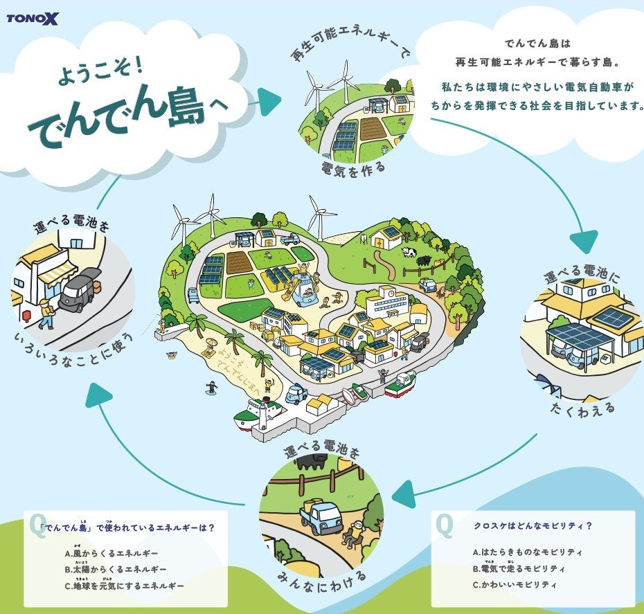 弊社は、“電気自動車だからできること”を実現する製品の設計・開発に取り組んでいます。社会のための製品、サービスのための製品という視点で、モビリティの新しい価値を提案していくことを目指しています。現在は、送電線インフラのない仮想の島「でんでん島」を設定し、モビリティとエネルギーを手軽に連携させる“運べる電池”の活用を検討しています。現実の世界でも離島や過疎地など、「でんでん島」に近い環境が存在しており、今後は実際の製品を用いた実証へ進めていきたいと考えています。