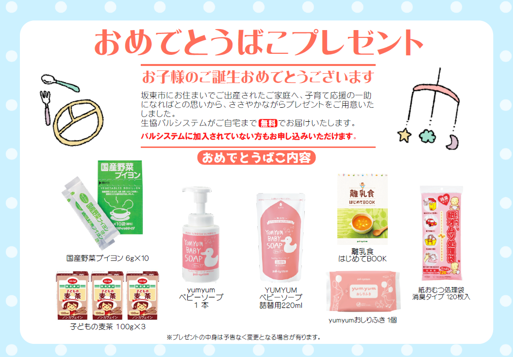 坂東市と締結するのは、「子育て支援の推進に係る連携協定」です。協定に基づき坂東市は、出生届の受付時に、出生祝いとして育児用品を詰め合わせた「おめでとうばこ」の案内カードを配付します。出生祝いは、パルシステムが宅配サービスで届けるベビーソープやおしりふき、離乳食づくりに役立つ食材などを詰め合わせます。
