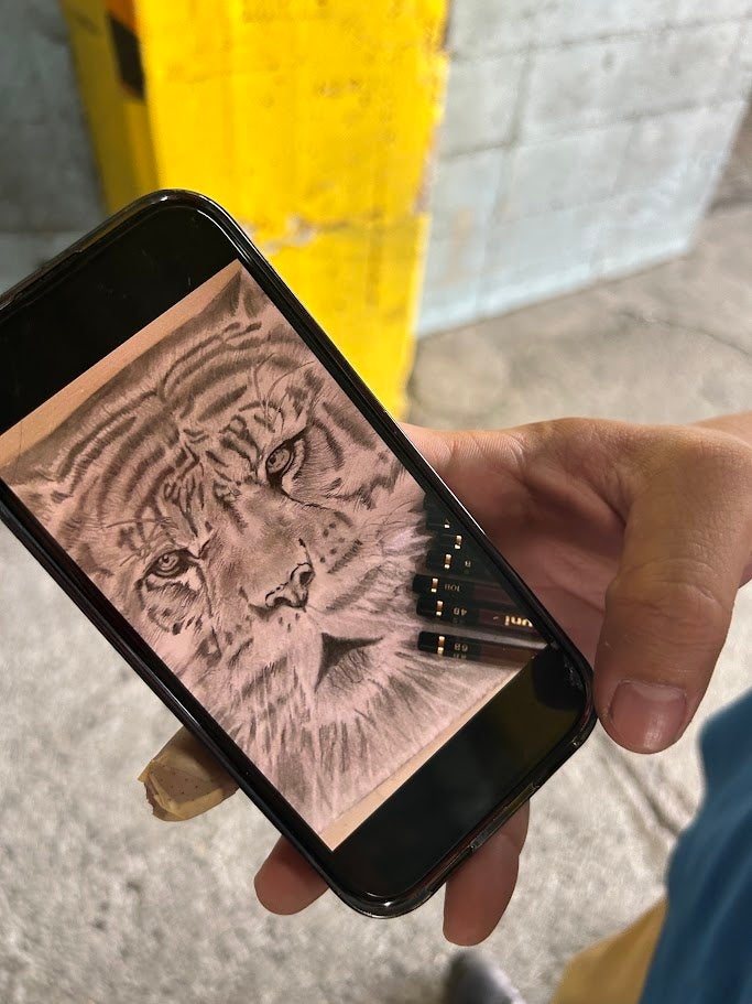 和田は趣味で絵を描く時も色を付けず、鉛筆と消しゴムしか使いません。黒と白だけで表現します。ただ、鉛筆は硬さや濃さが異なる複数本を使い分けます。例えば、下にあるトラの絵は10本の鉛筆を使っているそうです。最も濃い「10B」の鉛筆でトラの目を描き、ひげの部分は消しゴムを使っています。